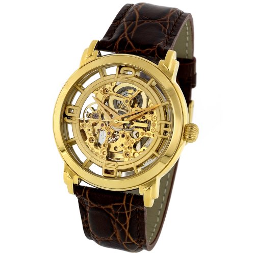 The definition of unexpected sophistication, this Stuhrling Original Men's Lifestyle 'Winchester' Automatic Skeleton Watch #165.3335E31 features a gold-tone dial, which is protected by a durable synthetic-sapphire dial window. A skeletonized design displays the mechanical movement, and a series of gold-tone alternating Arabic numerals and indexes bring at-a-glance precision. A rich brown crocodile leather band comes equipped with a sturdy buckle-clasp closure. Other details include 41.5-millimeter case and gold-tone stationary, stainless steel bezel. Powered by automatic-self-winding movement, this watch is water resistant up to 165 feet.