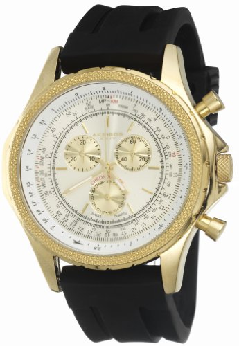 Warm gold tones and athletic details make the Akribos XXIV Men's 'Excaliber' Gold-Tone Chronograph Watch a versatile and stylish timepiece. This Greek watch offers a black rubber wristband and a stainless steel case with two large push pieces as well as a crown. A coin-edge gold-tone stainless steel bezel features an intriguing, textured pattern as well as a detailed white tachymeter that's continued on a cream-colored dial. Gold-tone bar hour indicators are complemented by gold-tone luminescent-tipped hands, while three silver-tone subdials round out this fine Akribos timepiece. The Akribos XXIV Men's 'Excaliber' Gold-Tone Chronograph Watch is water resistant to 165 feet (50 M).