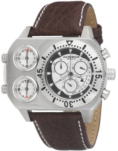 Strap on your own time machine with this eye-popping Akribos watch that features three time zone dials on a , elliptical-shaped stainless steel case. This unique timepiece also offers a brown leather band accented by white contrast stitching that joins to the case. A main circular dial is framed by a bidirectional, coin-edge, stainless steel bezel engraved with black minute markers. This silver-tone dial offers three subdials, geometric hour indicators, and elegant hands. Two separate time-zone dials to the left of the main dial are framed by polished stainless steel bezels and feature individual crowns. The Akribos XXIV Men's 'Time Machine' Triple Time-Zone Swiss Chronograph Watch is water resistant to 99 feet (30 M).